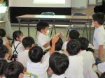 次は、多目的室でお話を聞きました。ごみの分別方法、ごみの減量方法、3R(リデュース、リユース、リサイクル)などについて、クイズも交えて分かりやすく教えていただきました。たくさんの質問にお答えいただいて、学習への理解を深め、ごみを減らすために自分は何ができるか考えることができました。