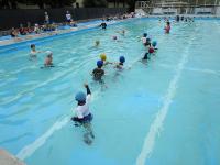 列ごとの順番で、プールを横切って進んでいくときは、前向きに歩いたり、横向きでカニ歩きをしたりしていました。顔を水につけて泳ぐように進む子どももいました。