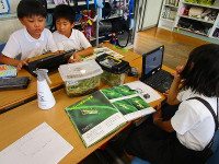 次に、観察をしました。さらに、図書室の本やインターネットで世話の仕方や体のつくりなどを調べ、大事に育てました。そして、観察したことや調べたこと、育てたことなどを、新聞や折りたたみ絵本、巻物などにまとめました。